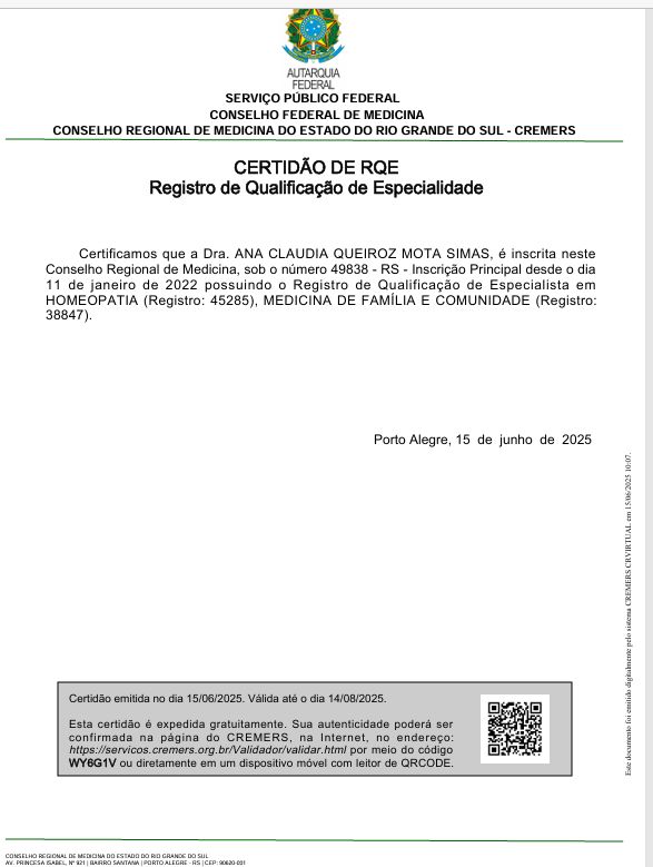 Sou médica com residência em Medicina de Família e Comunidade (RQE), titulada em Homeopatia (RQE) pela Escola Gaúcha, Prescritora de Cannabis Medicinal e professora de medicina endocanabinoide, com ampliação da arte de curar pela Antroposofia. Tenho ainda estudos complementares em Medicina Ortomolecular, fitoterapia e pós-graduação em Psiquiatria (não especialista).